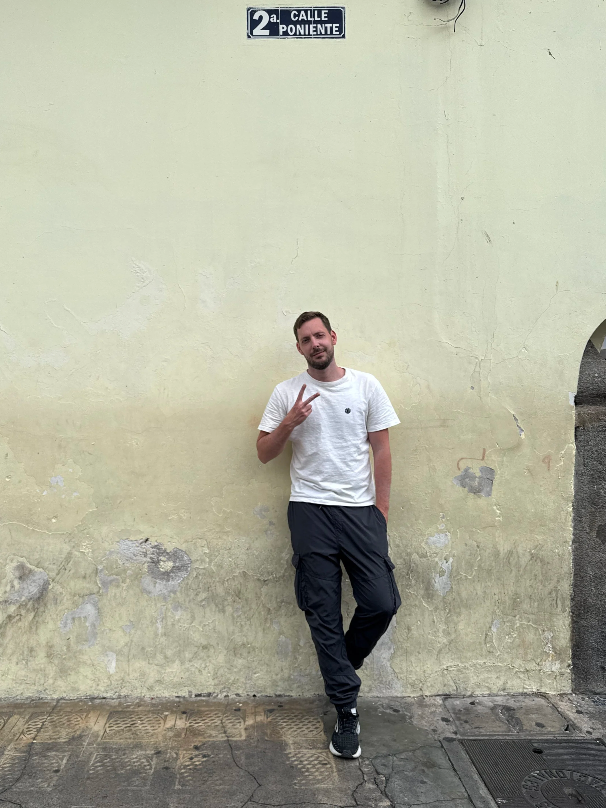 Pascal leaning against a wall relaxing after adventures, in Antigua, Guatemala